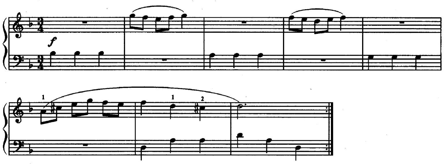 Задание 76. Теперь, увидев такие каденции, ты их с легкостью преодолеешь! Вниз от тоники отмерь октаву, сыграй ее крайними пальцами, а кварту возьми вторым пальцем. Взгляни на Менуэт Леопольда Моцарта. Все ли в нем ясно? Заметил ли ты «ловушки»? А где любимая каденция? Ну, тогда вперед, за «пятеркой», которую в данном случае получить — одно удовольствие! Сыграй текст максимально точно — за исполнение ставится одна оценка!